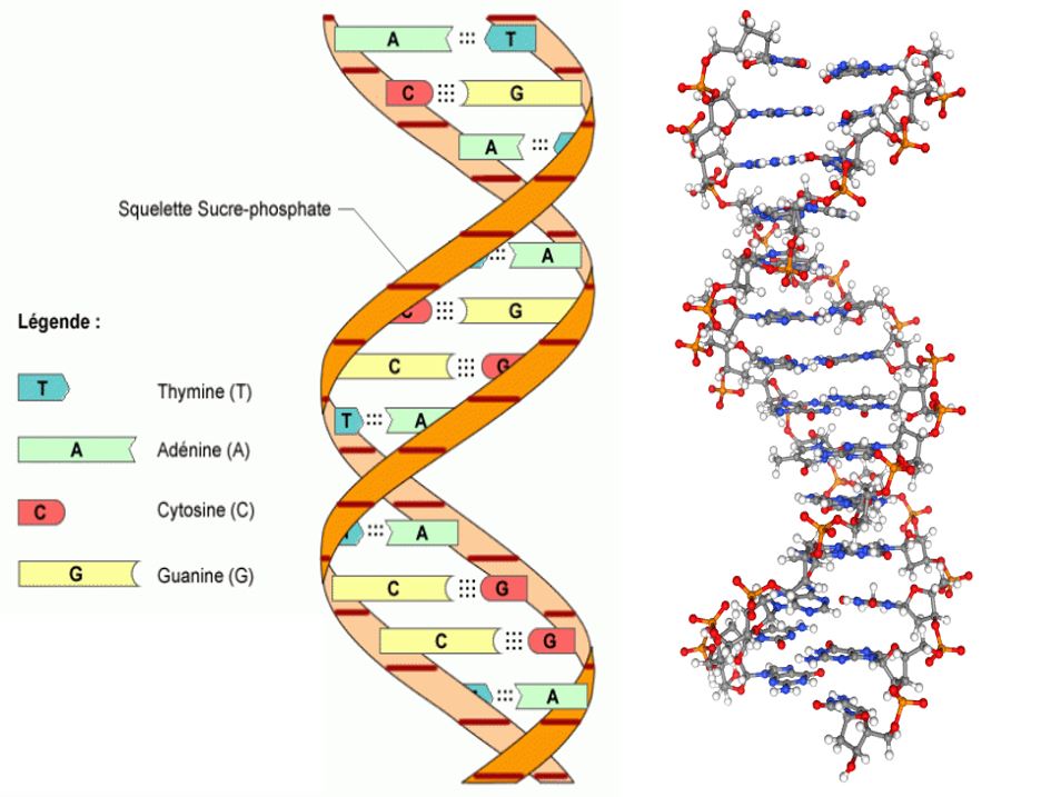 Il existe 4 nucléotides différents en fonction de leur base azotée : adénine, thymine, guanine, cytosine. Les nucléotides sont toujours associés par paire : L’ adénine se lie à la thymine ; la guanine se lie à la cytosine. On dit alors que les deux brins sont complémentaires.