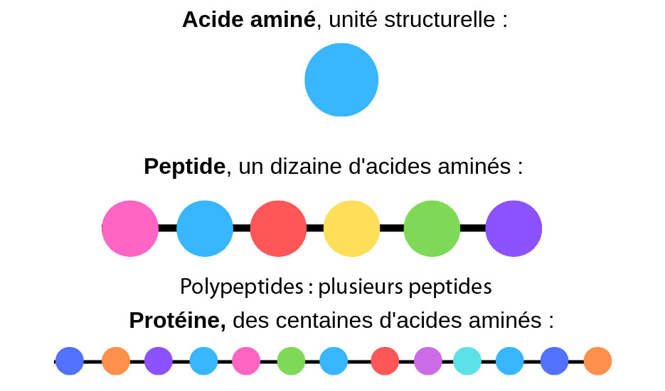 Une protéine est formée d’une ou plusieurs chaînes polypeptidiques, qui sont des polymères linéaires (=des successions en ligne d’un même élément) d’acides aminés (des molécules particulières) liés par liaison forte.