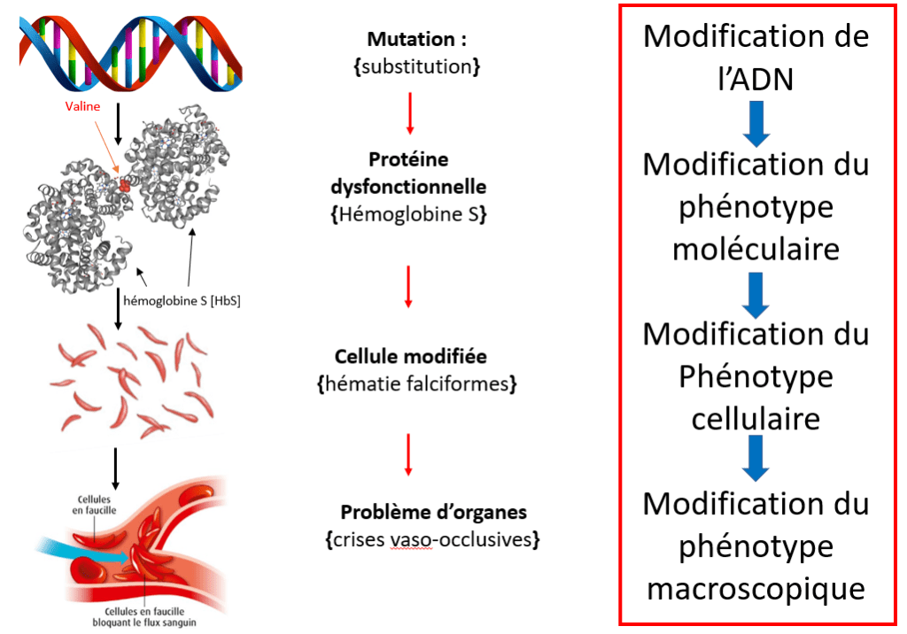 Le caractère héréditaire de certaines maladies témoigne de leur origine génétique. En effet, certaines mutations de l’ADN sont à l’origine d’allèles responsables de pathologies. Dans cette situation, l’expression des allèles mutés perturbe la formation de protéines fonctionnelles. Le phénotype moléculaire est ainsi modifié, ce qui a des répercussions sur le phénotype cellulaire et le phénotype macroscopique.